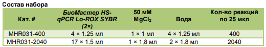 Набор БиоМастер HS-qPCR Lo-ROX SYBR (2×) содержит 2× реакционную смесь БиоМастер HS-qPCR Lo-ROX SYBR (2×), 50 мМ раствор MgCl2 и стерильную воду.