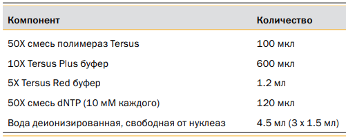 Набор реактивов Tersus Plus PCR kit содержит все необходимые компоненты для постановки 200 стандартных ПЦР амплификаций объемом 25 мкл. В состав набора входят два реакционных буфера, использование которых расширяет сферу применения фермента и облегчает работу по оптимизации условий реакции.