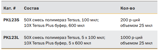 Смесь Tersus поставляется вместе с новым улучшенным 10X Tersus Plus буфером, который обеспечивает оптимальную работу входящих в ее состав ферментов, а также облегчает амплификацию GC-богатых участков.